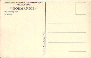 | SERIE 1 BRISTOL CLASSIQUE COULEUR PAILLE CLAIRE VERSO : PHOTO AVEC MARGES - "S/S "NORMANDIE" / Cie Gle TRANSATLANTIQUE EN BAS AUX EXTREMITES - ENCRE NOIRE RECTO : BLOC-TEXTE VERTICAL AVEC TITRE, SOUS-TITRE ET DESCRIPTION TECHNIQUE - |