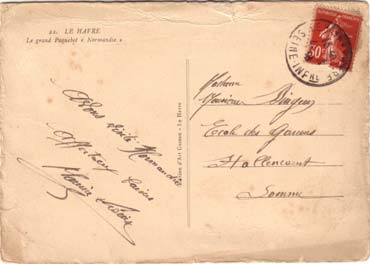 RECTO : NUMERO, TITRE ET SOUS-TITRE SUR 2 LIGNES EN HAUT A GAUCHE TEXTE DE SEPARATION VERTICALE SUR UN DOUBLE TRAIT : "Edition d'Art Gazeau - Le Havre" ENCRE NOIRE